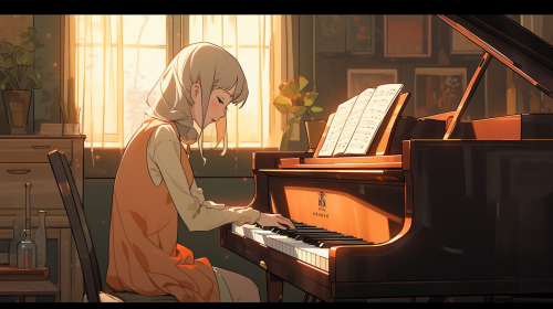 lofi girl floating on a cloud in the style of 90s anime, muted color palette --niji 5