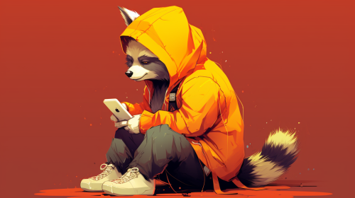 anime style racoon wearing red hoodie and basketball sneakers, sitting on sidewalk, browsing mobile phone, street, simplified, logo, red and yellow --ar 16:9