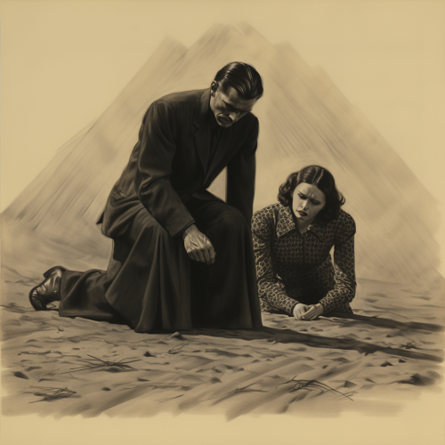 drawing, man on ground, woman standing, crying, 1930's clothing, background obscured