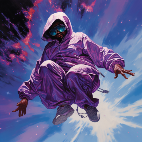 a flying white man in a purple space, dressed in a tall retro purple and blue jacket, hodded and masked, retro fanstastic draw, for cover rap album