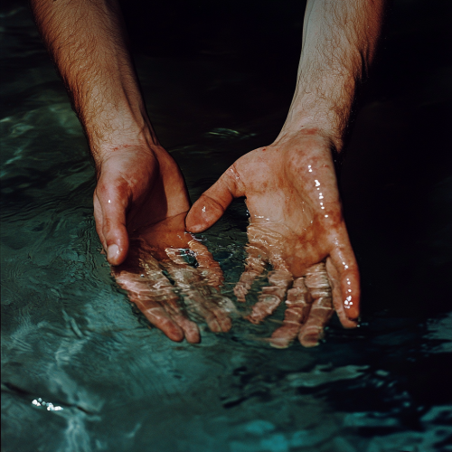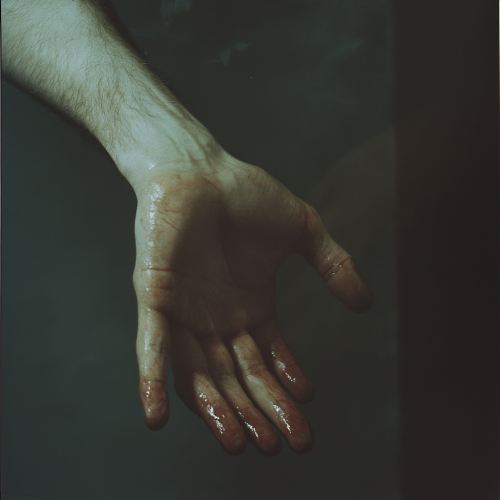 wolfgang tillmans photograph, discolored, bruised hands emerging from void, soft lighting, fingers limp like god reaching out to touch david, cool tones, melancholy