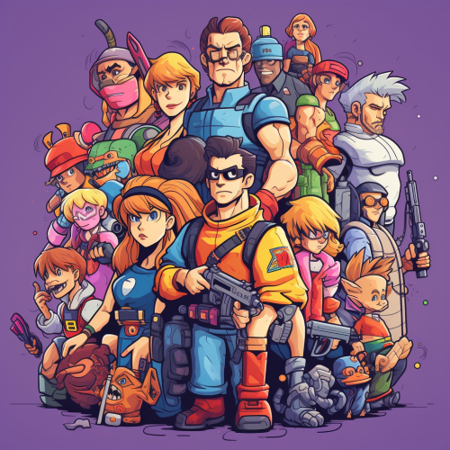 Collage mural of cartoon monsters, new school tattoo, ink drawing, vibrant colours