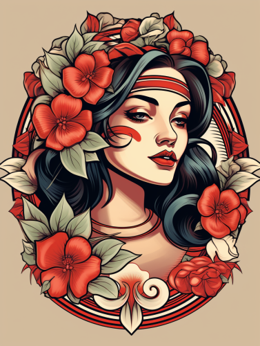 Old school tattoo template of an Indian woman in a 70s look with a red headband. combination with roses in an oval frame. limited color palette, earth tones. very thick outlines. --ar 3:4