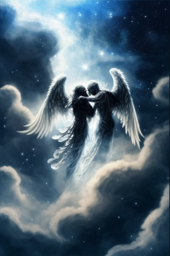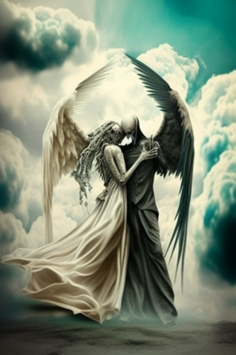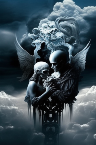two lovers reunited, loving embrace, and heading to heaven, transparnt angels, light, clouds, skulls, flying, dream background, beautiful, peaceful --chaos 100 --ar 2:3 --stylize 50