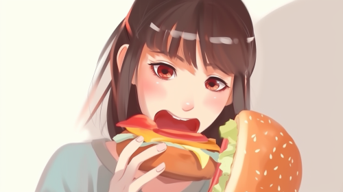 cute cartoon girl hoding a Hamburger , close up, two hands holding the hamburger, open the big mouth, abstract --ar 16:9 --v 5.0
