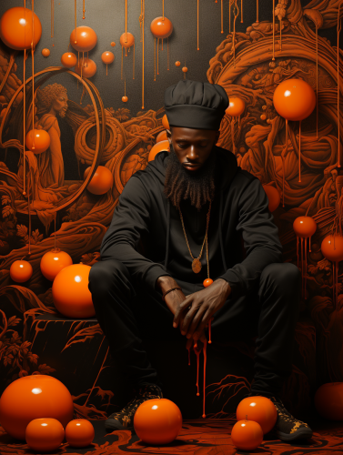 a mural of man on a orange wall with black and gold fruit in the by ingrid baars, 32k uhd, benin art, melting pots, paolo veronese, commission for, chiaroscuro portraitures --ar 3:4 --style raw --s 750