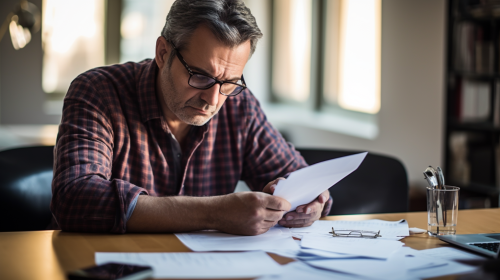 A concerned-looking person examining a bill or cost estimate, sitting at a desk. The scene includes a calculator, stacked coins, and financial charts or tables in the background, emphasizing financial planning and the concept of costs. The person is middle-aged, of Caucasian descent, wearing casual office attire. The setting is a home office with a window showing a cityscape in the background., cinematic shot --ar 16:9