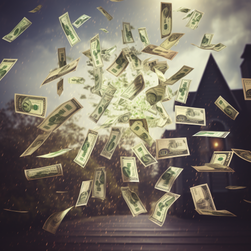 Graph showing home prices skyrocketing and dollar bills raining from the sky
