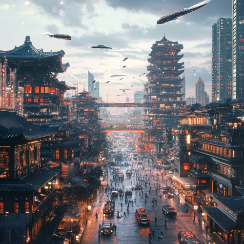 How does Beijing look in the distant future, fascinating, 7000s, creative, realistic, photographic of Beijing city, incredible, street 3D rendering, different perspective, people, city lights, flying people, flying cars, robot dogs