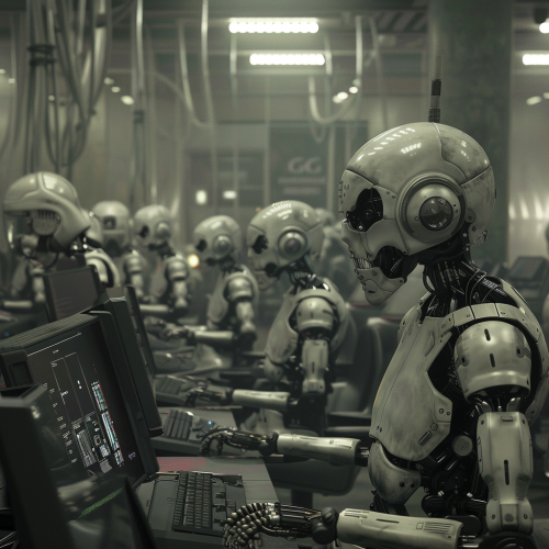hyper-realistic photo of a busy multimedia news room with all the humans sitting at their computers cowering as robots stride around and point at them telling them what to do --v 6.0