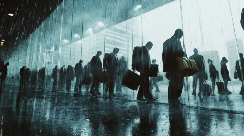 a long interminable line of exhausted office workers carrying their briefcase standing in a cue , infront of a full occupied meeting room, rainy day , 24 mm, realism image, cinematic style , hyper-realistic, highly detailed, daytime scene, atmospheric lighting, rich in detail, photography, high quality, --ar 16:9 --v 6.1