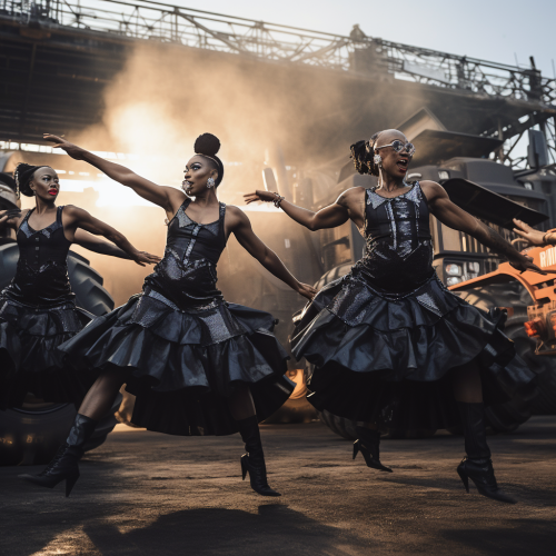 a real foto of a group of young woman ballet. this girls is blond with a big lag, biggest mouth and big eyes with a long hair flying. This group smile atractive and day is hot, extremaly hot and warm. color dominant is orange and red. this girls is very wet of pool