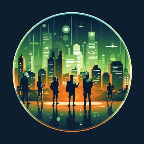 vector art of Circle badge displaying a group of humans and robots on phones reporting crime with a cityscape in the background in dark blues, bright greens, whites and oranges RGB vector art, minimalist, silhouette lighting, high contrast, icon design --ar 1:1 --v 5.2