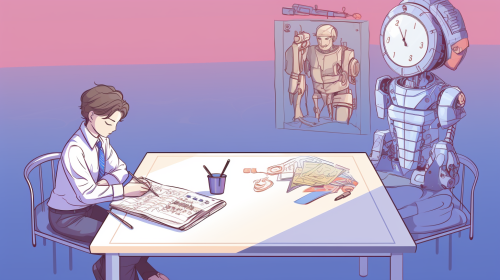 A human figure and a robot sit on opposite sides of a table, each holding a pencil. Between them is an open notebook with a single, changing prompt written on it. Above the notebook float two icons: a clock and a puzzle piece, symbolizing time-saving and nuance learning. Use a light blue and lilac color scheme. --ar 16:9