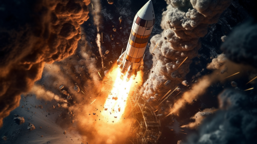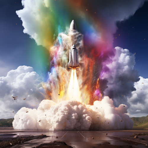a rocket blasing off into space, massurrealism, intricate details, clear features, global illumination Nikon D850 DSLR 200mm f/1.8 lens, f/2.2 aperture, 50k, 3D, UHD, rtx on --v 5.1 --s 1000 --ar 16:9