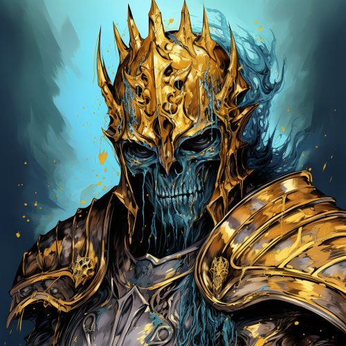 fantasy illustration. A putrid rotting gold and silver demonic roman legionnaire looking wicked, monstrous features. covered in smoke. gothic horror vibes. alcohol ink style. cerulean background --v 5.2