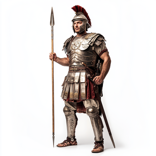 A Roman ancient soldier in armor, holding a shield in the left hand, and spear in right hand, full-body standing pose, white background, very photo realistic style, simple lines, no shadow, red color scheme, iron chestplate, red tunic, brown pants, yellow boots, two stripes of cloth tied around the waist. The man is wearing golden rings as jewelry. There's also a small Roman cross symbol drawn on his right shoulder. --s 1000 --q 2