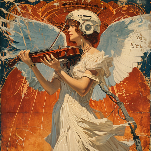 1920s folk country music album cover depicting a cybernetic woman, cheerful, serene, light colors, beautiful, romantic, --v 6.0
