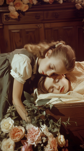 A hyper-realistic photo from the 1950s depicting a 10-year-old girl leaning over the coffin of her deceased friend to give him a farewell kiss during the wake. --ar 9:16 --v 6.0