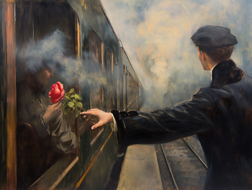 handsome man in train say goodby to his pretty woman stands in train platform in train station and cry,classic art,portrait --ar 16:9 --s 250 --style raw