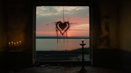 a renaissant style painting of a heart with a sword through it hanging in the wall of a castle in denmark, by the sea, sunset sea view outside of big windows, 1700s, movie still from sophia coppola film , cinematic, 35mm film, soft natural light, gloomy --ar 16:9
