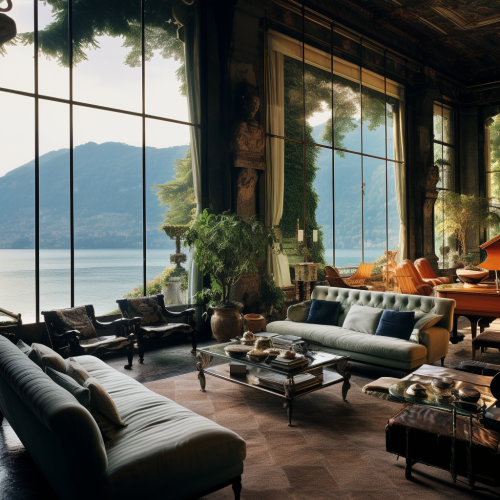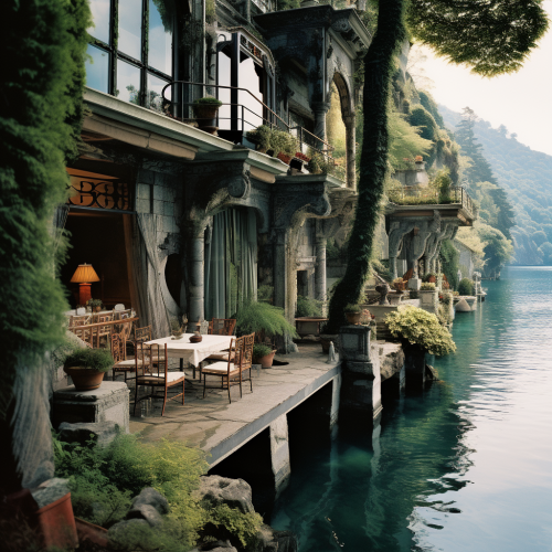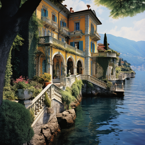 A golf course overlooking Lake Como in the style of Shinnecock Hills running along the coast into the distance. Shot at golden hour with a light fog. Italian Influenced Colourful Gardens, Joyful Celebration of Nature. Emphasisers: GreenCore, Depth of Field Camera: Shot on a Hasselblad medium format camera. Carl Zeiss Distagon t* 15 mm f/ 2. 8 ze, Ricoh r1 --s 250