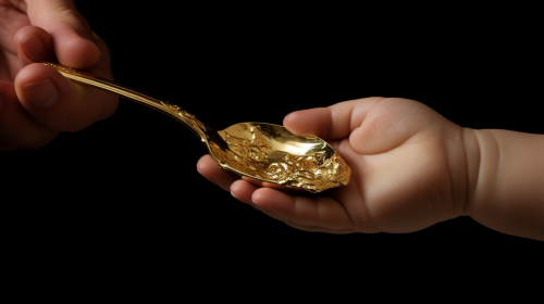 The adult hand that gives the gold spoon and the baby hand that receives it. picture style. --ar 16:9