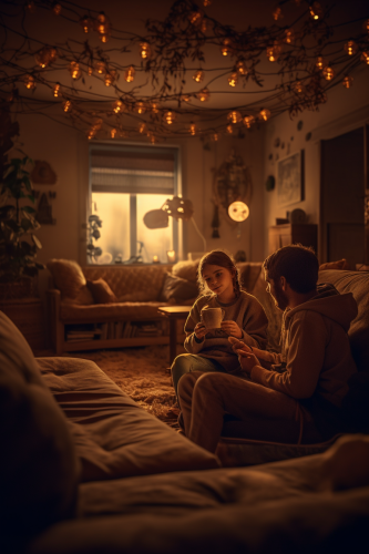 photo of a cozy and warm indoor setting where a smiling 13 year old child and parent are sitting together on a couch playing video game, in the style of golden light, photorealistic fantasies, sigma 85mm f/1.4 dg hsm art, photorealistic pastiche, monumental, expressive --ar 2:3 --v 5.0