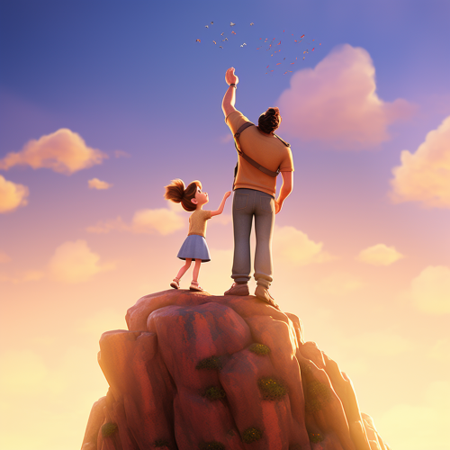 daddy lifting his baby girl up to the sky to show her to those below the cliff, holding baby's waist very tight with his both hands, dad and baby girl looking at same direction, on cliff from the opening sequence of the LION KING, clear sky, wilderness, pixar style 3D, wearing pants, from below --v 5.2