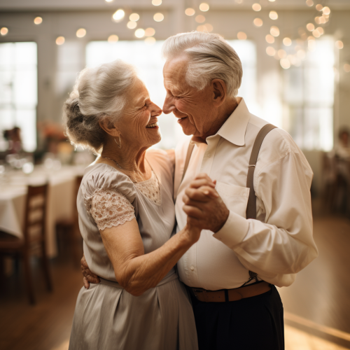 Photograph of an elderly couple dancing at a spring-themed dance in a cafeteria, in the style of romantic light, Leica SL2, affectionate expressions, high dynamic range image, soft focus, classical art, Renaissance influence
