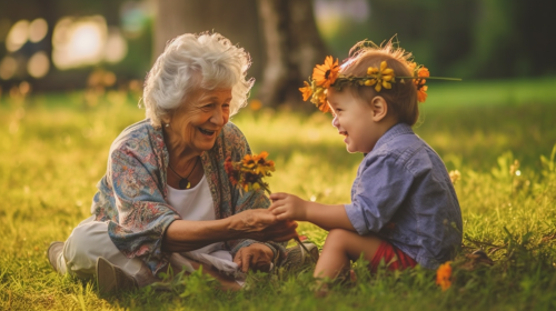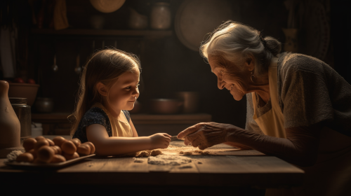A heartwarming scene of a little girl and her grandmother baking together, warm lighting, cozy kitchen atmosphere, focused on the joy and love between the two, Photography, Canon EOS 5D Mark IV, 50mm lens, soft natural lighting, --ar 16:9 --v 5.0