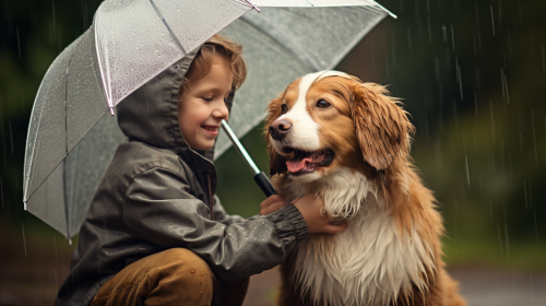 a photograph of a kid holding an umbrella protecting a cute dog from the rain --ar 16:9