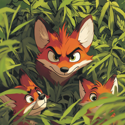 Zane, a sly, sharp-featured fox with red-orange fur and narrowed eyes, sneaks out from the thick, green bushes. His expression is mischievous, and he has a cunning smile on his face. Romy and Niko are standing in the foreground, looking surprised and slightly nervous, with wide eyes. The scene has a sense of tension, but the colors remain vibrant and cartoonish.