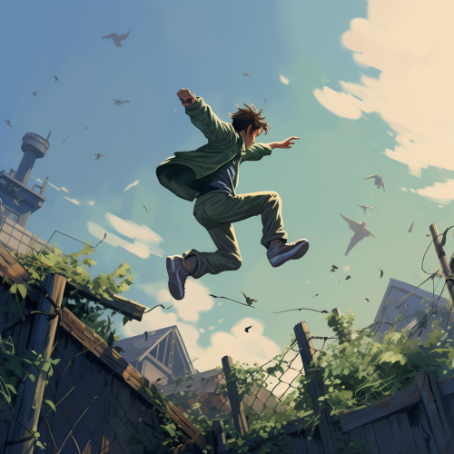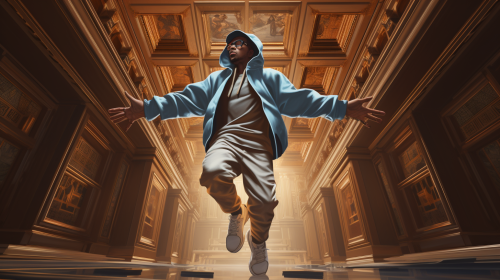 man in luxerious high end hip hop fashion wearing hoodie and sweatpants jumping through a cultural portal, ultra realistic, hyper realistic, ultra detailed, hyper detailed, --ar 16:9