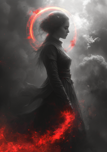 An incandescent Divine Character expression god or godess image with Witch's curse, Shotgun, Technoforming, a divinities styles, and a Grayscale view --v 6.0 --c 15 --ar 5:7 --s 750