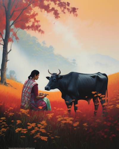female farmer and her cow, story telling, vivid, beautiful, --ar 4:5