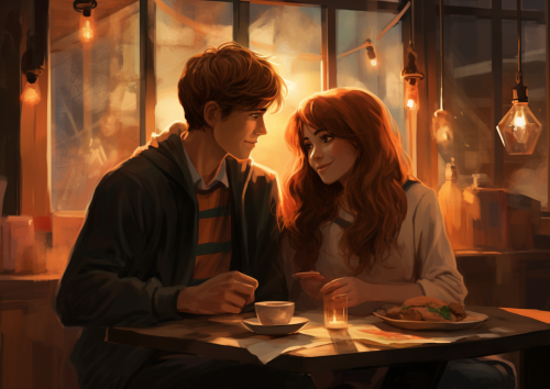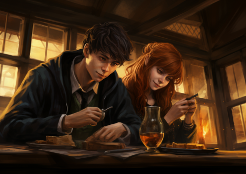 long-range plan, Harry Potter, Ron and Hermione drink butter beer, drawing, --ar 7:5