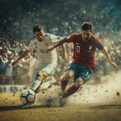 huge soccer game like the World Cup, showing the excitement and size of the event. Ronaldo and messi are going head to head, thousands of fans are cheering in the background. Photography realistic