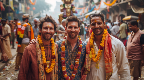 Cristiano Ronaldo, Lionel Messi, and Neymar, the famous football players, standing together in a group photo on the vibrant streets of India during the Ganesh Chaturthi festival. They are all wearing traditional Indian attire: Ronaldo in a maroon sherwani, Messi in a royal blue kurta with gold embroidery, and Neymar in a white kurta with a gold dupatta. The three players are smiling, arms around each other, enjoying the festive vibes. Behind them is a large Ganesh statue, with colourful floral garlands and vibrant decorations. The street is filled with people celebrating joyfully, creating a lively, festive atmosphere rich with Indian culture --ar 16:9 --v 6.0 --style raw --s 750