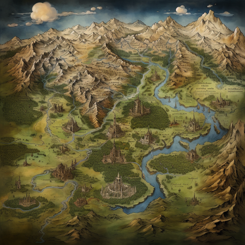 Detailed fantasy RPG game map of a world with 6 distinct kingdoms. Contains mountains, rivers, deserts and forests. Top-down illustration, in black ink on paper. --ar 16:10 --s 0 --no words, type, text, europe, earth