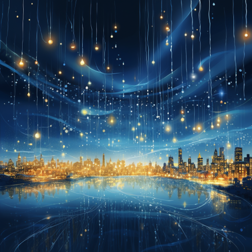 city of blue glass flying through a blue sky trailing long strings of yellow christmas lights, colorful illustration