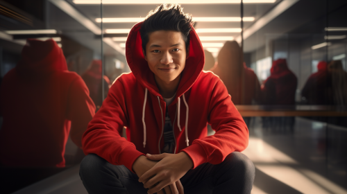 Early morning daylight scene, Jay Fansey cover, Asian men's red hoodie, smiling and chewing gum, arms crossed in front of him.photorealistic, volumetric lighting,film and television mirror sense --ar 16:9