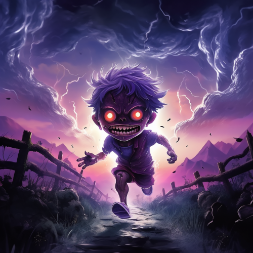 iron maiden poster type wallpaper with a cute but evil purple demon running towards, anime style, 4k