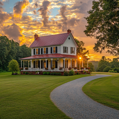 A beautifully maintained two-story farmhouse set against a glowing sunset, with a red metal roof and a white wooden exterior. The house features classic black shutters and a wraparound porch adorned with flower pots and rocking chairs. A curved gravel driveway leads to the house through an expansive, green lawn. The scene is framed by mature trees, and the sky is filled with soft clouds illuminated by the golden hues of the setting sun, adding warmth and serenity to the rural landscape.