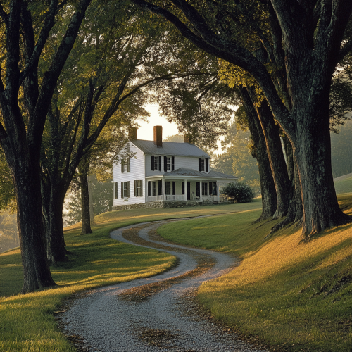 A picturesque white farmhouse nestled among towering trees in the peaceful countryside. The house, with its classic black shutters and simple porch, stands at the end of a curved gravel driveway that winds gently through a sea of green grass. The scene is bathed in the soft, golden hues of early morning sunlight, creating a warm and welcoming atmosphere. The surrounding trees, their branches stretching overhead, provide shade and add to the idyllic, serene feel of this rural retreat.