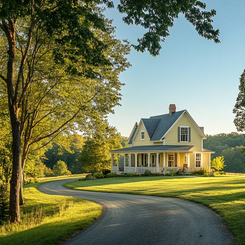 A charming farmhouse nestled in a picturesque rural setting, with a soft yellow exterior and classic white trim. The house has a sloping roof and a welcoming porch that extends along the front. A winding asphalt driveway meanders through the rolling green lawn, leading up to the house. Tall trees with wide branches frame the view, as the early morning light softly illuminates the scene, capturing the essence of calm country living.