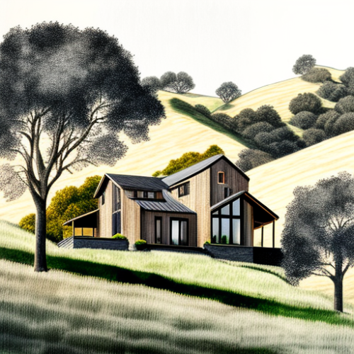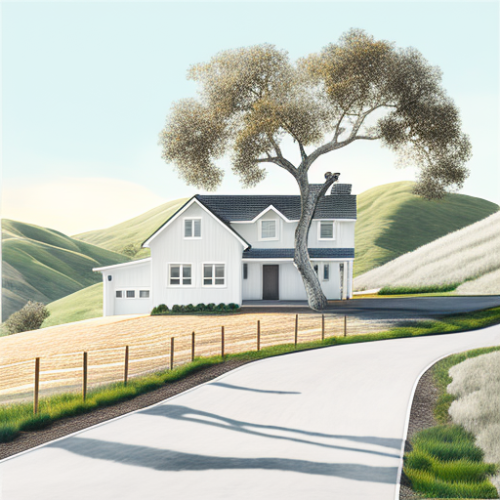 white board and baton modern farmhouse in a photographic style on sloping field amongst oak tree hills of the San Francisco Bay Area during midday with driveway extending from house to a road at a 3/4 angle --upbeta --v 4 --s 750