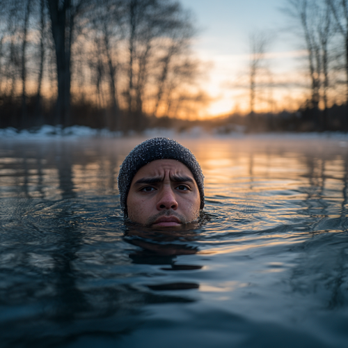 a brisk morning, 1 man is in a lake submerged up to his neck. mid 30s . One hispanic. he is cold are cold, the water has took his breath away. There is trees in the background and the sun is just rising. The photo is a wide shot taken on a sony a7iV on 14mm lens. he is holding the camera like its a selfie. He looks in pain from the coldness of the water. it should be hyperrealistic and 8k. he is wearing a beanie
