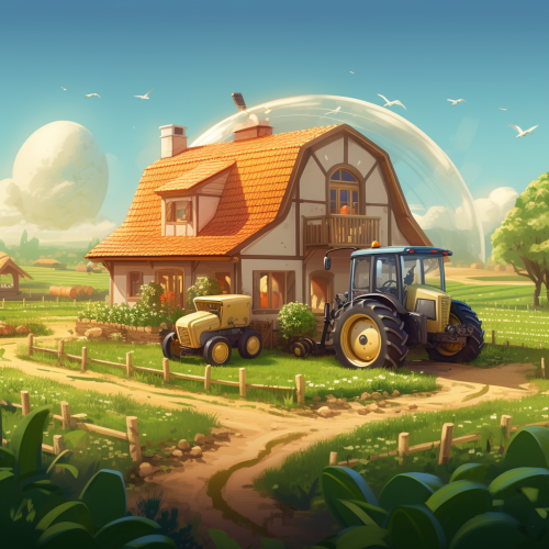 a beige domed roof farmhouse with crops and a tractor surrounding the scene, iscometric game illustration 2.5d