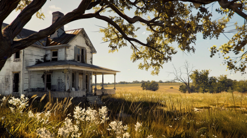 In the year 1882. A sun-beaten, two-level farmhouse built in 1860, with a covered porch in rural Oklahoma. Directed by Katheryn Bigelow. Style of Andrew Wyeth. Cinematic. Color. 32k. --style raw --ar 16:9 --v 6.0